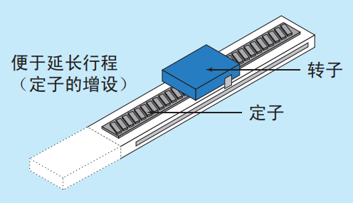 采用扁平构造,安装空间小,在转子与定子之间的磁吸力作用下,可实现导轨的高刚性化。