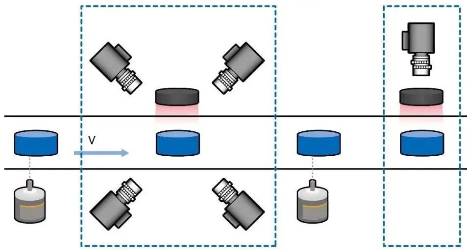 另外四个相机互成90°从侧面拍照检测瓶盖侧壁,做到360°全视角检测,消除鱼眼镜头带来的畸变问题。