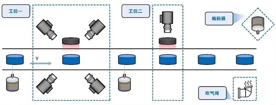 双工位独立检测瓶盖侧壁及瓶盖顶部,配合编码器触发,然后由PLC与机器界面记录NG瓶盖的位置进行打落,实现高速全视角瓶盖缺陷检测。