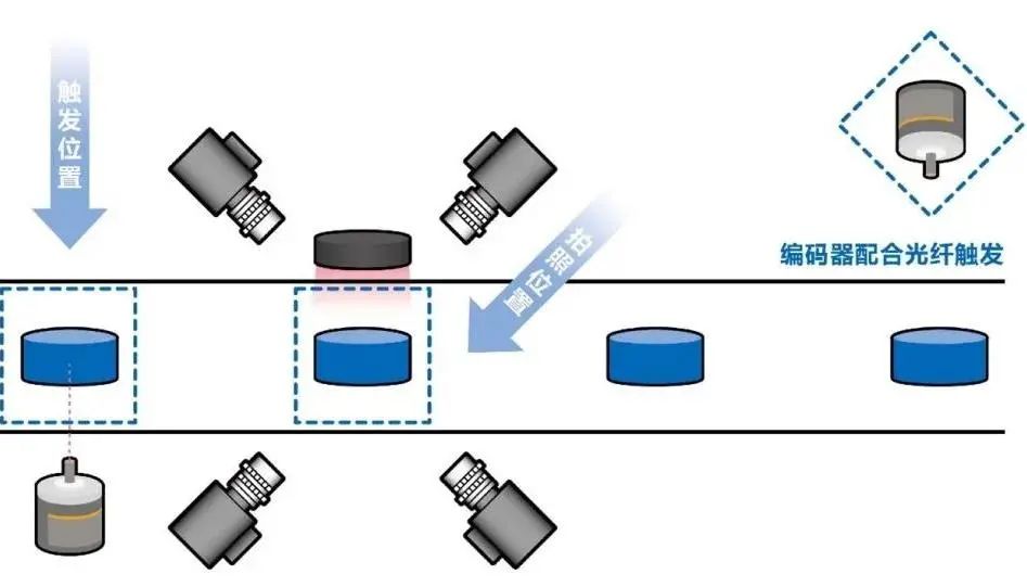 首先通过软件程序优化及硬件配置升级,确保检测部分的性能满足需求。之后,通过图像处理系统FH系列自带的编码器触发功能,将触发位置提前,实现触发位置与拍照位置分离,既能排除光纤红光干扰,也能实现在不同速度下的精准触发(拍照)。