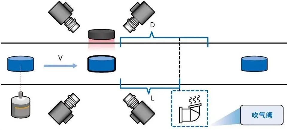 两个关键因素点(L与T)不论哪个值有偏差都可能造成漏吹、多吹或者误吹。因此,通过编码器触发的方式,由PLC记录NG(不良品)的编码器位置,再配合机器界面修改参数,实现精准剔除(由吹气阀将其吹落)。