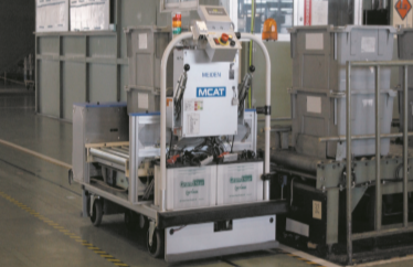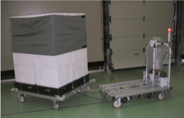 MCAT牵引的产品手推车包括箱型托盘与平面托盘 2种类型。利用连接销与托盘台车连接后,自动搬 运到保管仓库。