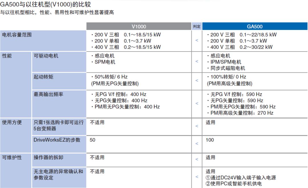 相比原来V1000系列,本次GA500系列更新,增加重载18.5KW和22KW两个功率段。