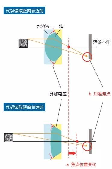 ■V430-F / V420-F 系列中采用的液体镜头即使在条码读取距离发生变化时,也可通过施加电压,改变水和油的形状,使光折射,自由改变焦点位置(下图a)。