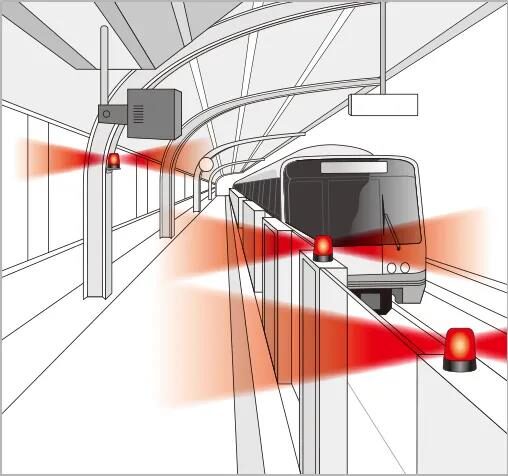 与紧急通知按钮联动发出警报。通过声光向周围乘客警告火车驶近或其他异常情况的发生。