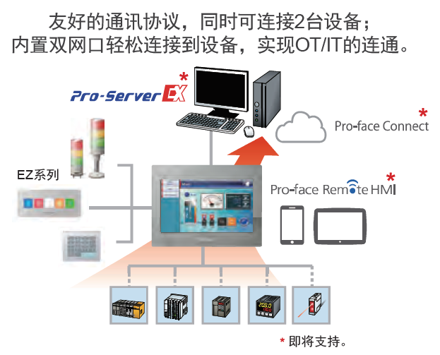 ● 拥有足够的接口和通讯协议,实现 Pro-face 广泛的连接性,达成以 HMI 为中心的理念